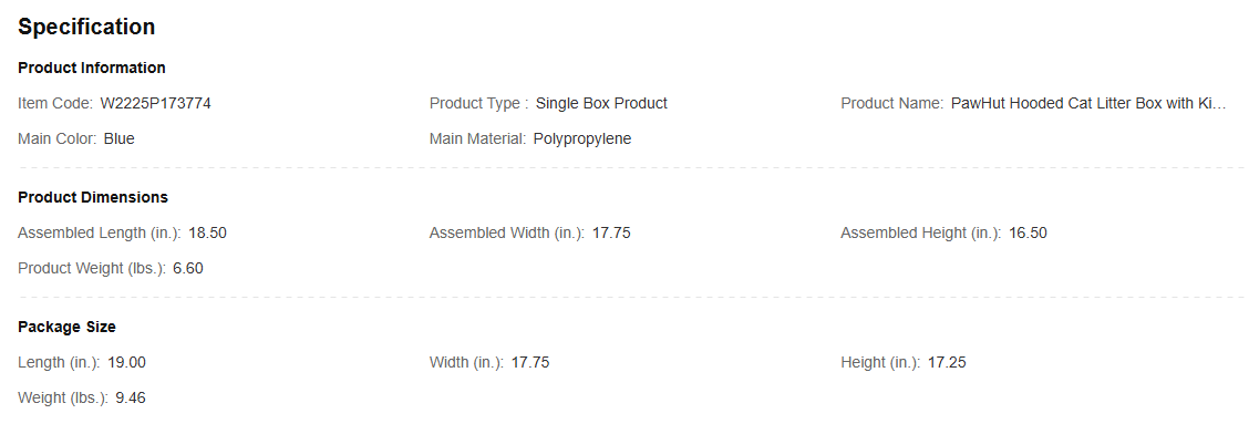 - Hooded Litter Box Info: Overall Dimensions: 18.5″ W x 17.75″ D x 16.5″ H. Front Door Dimensions: 8″ W x 7″ H. Weight Capacity: 18 lbs. Suitable for Cats Up to 10 lbs.