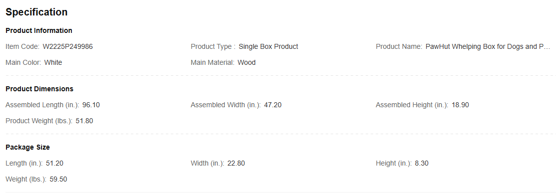 - Whelping Box Info: Overall Dimensions: 96.1″ L x 47.2″ W x 18.9″ H. Suitable for large-sized dogs and below.