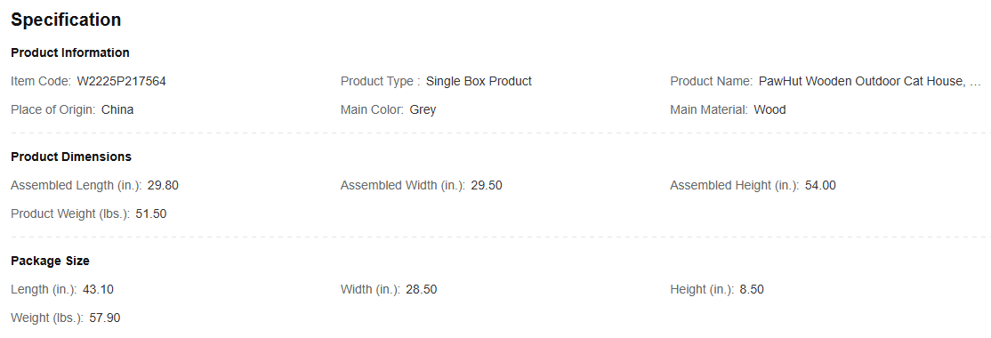 - Feral Cat House Information: Overall Dimensions: 29.75″ L x 29.5″ W x 54″ H. Bottom Cat Box Dimensions: 27.5″ L x 26.75″ W x 9.75″ H. Suitable for cats within 10 lbs. Assembly required.