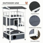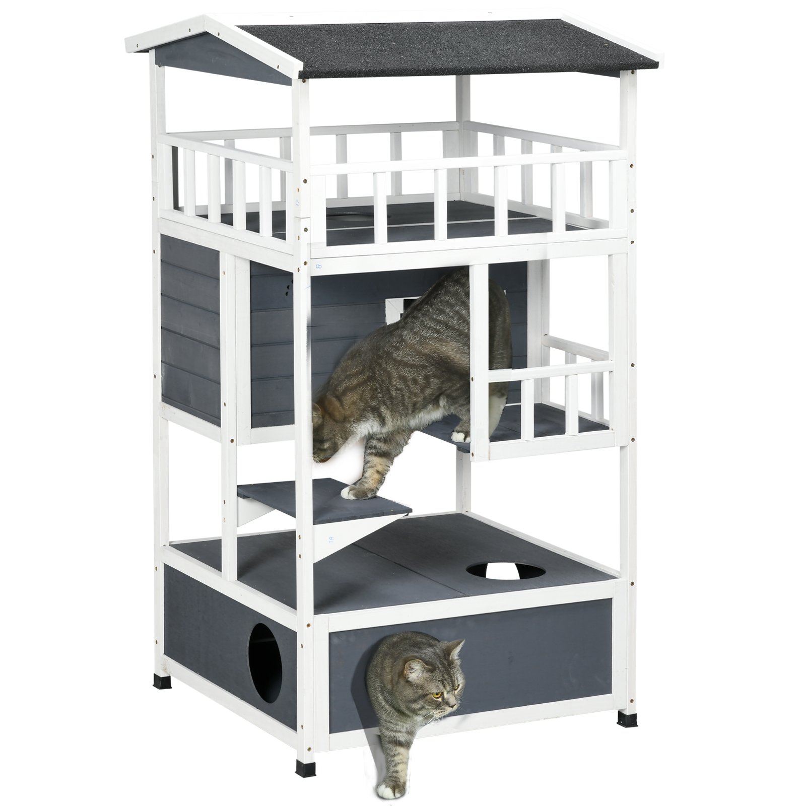 PawHut Wooden Outdoor Cat House, Feral Cat Shelter Kitten Tree with Asphalt Roof, Escape Doors, Condo, Jumping Platform, Grey